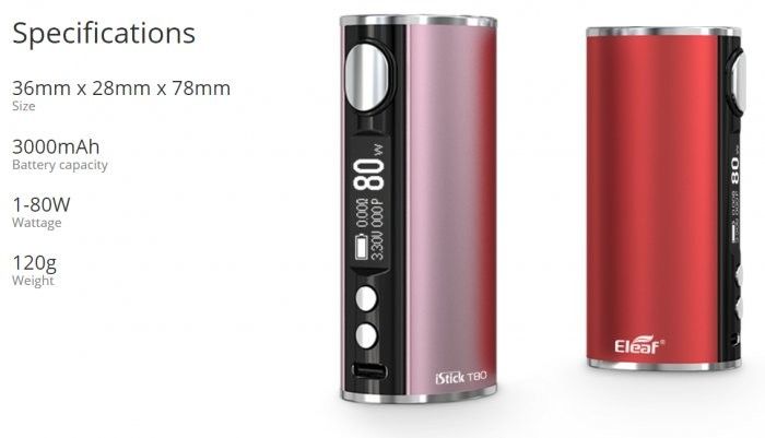iStick T80 je novým členem nejpopulárnější a nejoblíbenější řady gripů od Eleaf. Celokovové tělo ukrývá vestavěnou baterii o kapacitě 3000mAh, která je podporována inovativním systémem rychlého nabíjení QC3.0 s dobou nabíjení pouhých 90-ti minut. iStick T80 nabízí nastavitelný výkon až 80W. Přehledný OLED displej nabízí detailní informace o nastavení. Mezi jeho další přednosti patří ochrana proti zkratu, přehřátí, přežhavení, nízkému odporu a 10-ti vteřinová ochrana žhavení