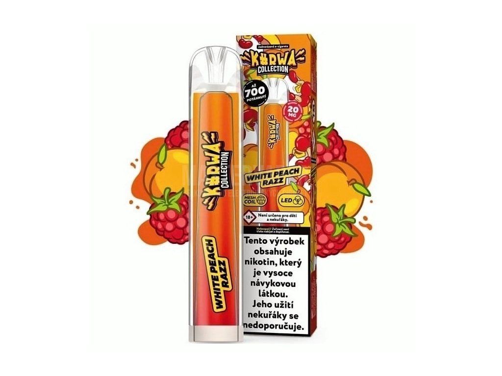 Netradiční chuť, kde se dokonale doplňují šťavnaté broskve s plnými tóny sladkých malin. Další série oblíbených jednorázových elektronických cigaret, nesoucí název Kurwa Collection. Tato jednorázová e-cigareta disponuje dostatečně silnou baterií o kapacitě 500mAh, se kterou dosáhnete až 700 potažení. Objem náplně 2ml, obsah nikotinu 20mg/ml, LED podsvícení, Výrobce Kurwa.